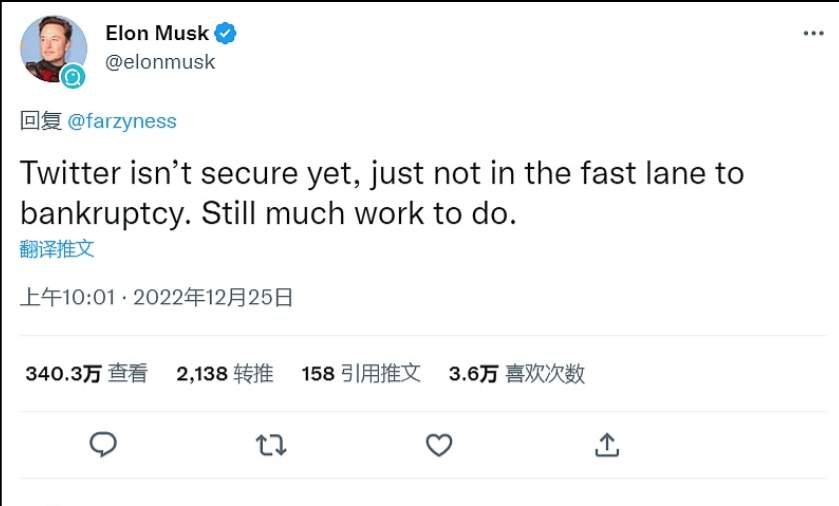 12月26日消息,马斯克在回复推特用户时表示,尽管已经控制住了开支,但推特目前还不安全。公司只是没有走上破产的快车道,但仍有很多工作要做。据此前消息,马斯克表示一旦找到继任者便会辞去CEO职务,之后将只会负责管理软件和服务器团队。
