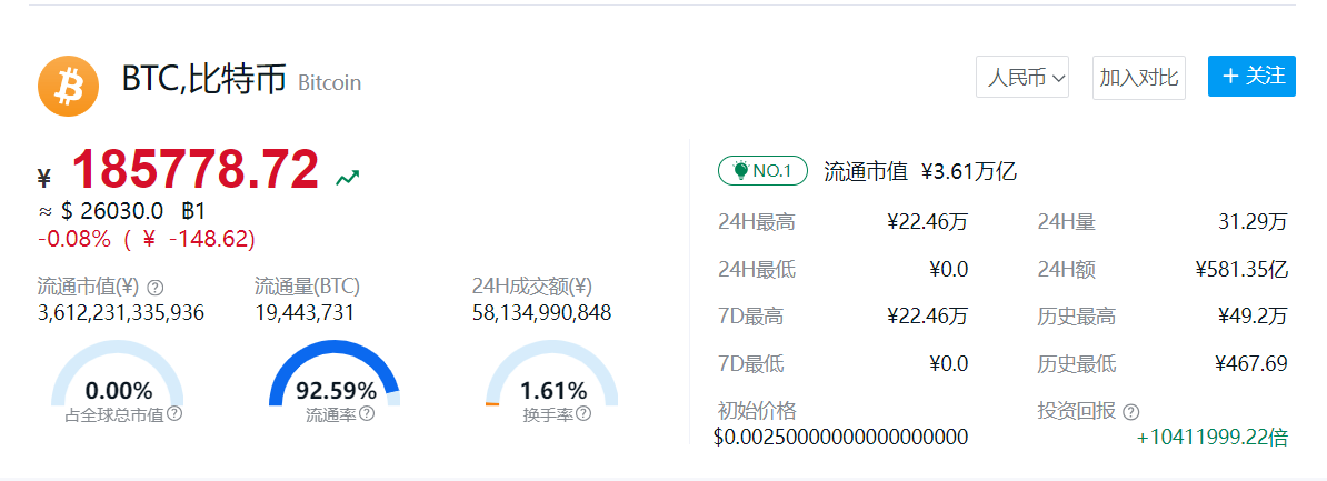 比特币现在为¥185778.72元,24小时成交额¥58134990848。