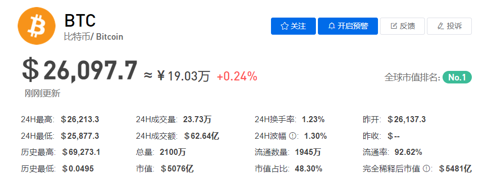 现在比特币的价格是$26097.7,24小时最高价格为$26213.3,24小时最低价格为$25877.3。
