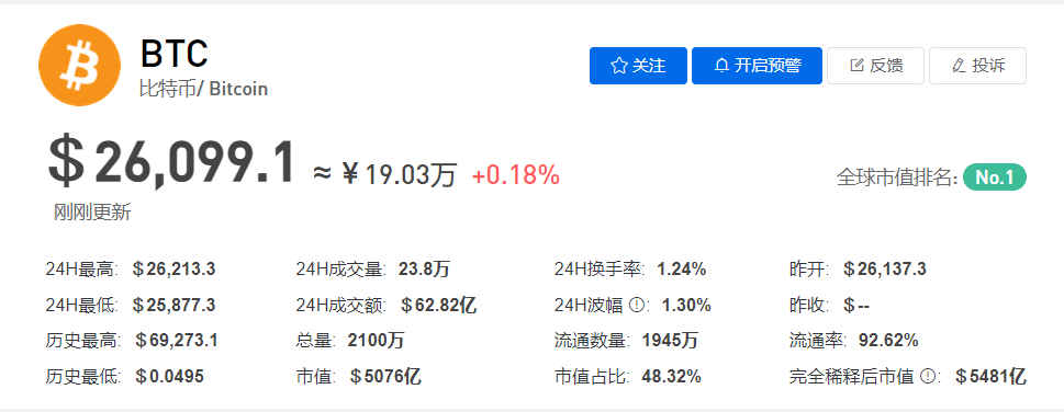 比特币目前价格是$26099.1,目前市值排名第一,24小时成交额是$62.82亿。