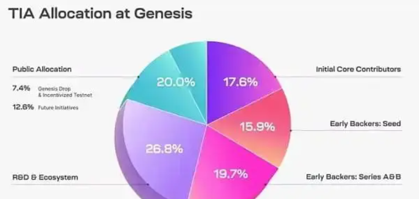 TIA供应总量为10亿枚,具体分配如下:26.8% 分配给 Celestia 基金会和核心成员,20% 用于公共分配,17.6% 分配给初始核心贡献者,15.9% 分配给种子投资者,19.7% 分配给 A 和 B 轮早期投资者。