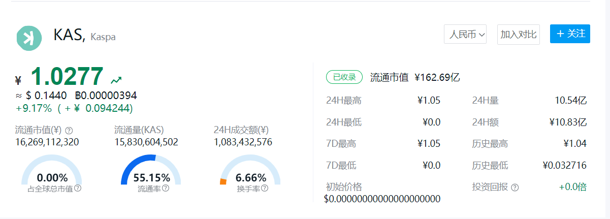 KAS今日价格最新行情为$0.144,24小时流通量为15830604502,24小时成交额为1083432576,流通市值为16269112320。
