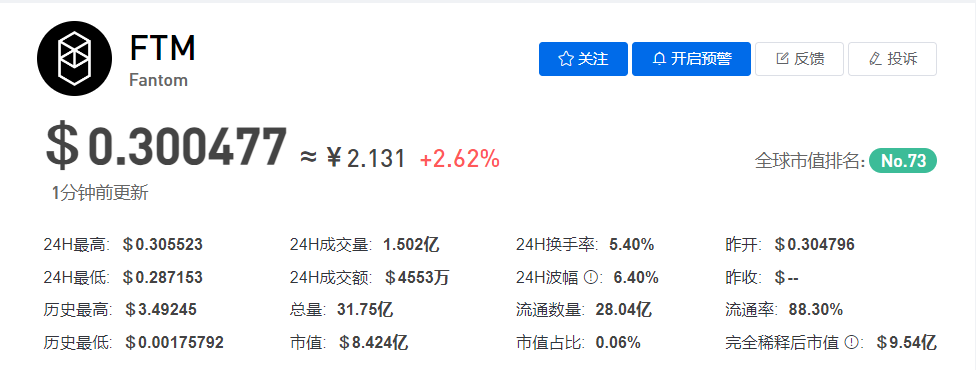 FTM币今日价格行情为$0.300477,24小时价格上涨了2.62%,流通数量为28.04亿,市值为$8.424亿,历史最高价格为$3.49245。