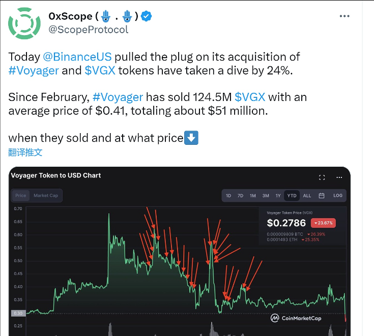 Web3知识图谱协议0xScope监测数据显示,自2月以来,Voyager已售出1.245亿个VGX,均价为0.41美元,总计约5100万美元。目前,Voyager仍持有5242万个VGX代币,按当前0.277美元的价格计算,价值约1465万美元。