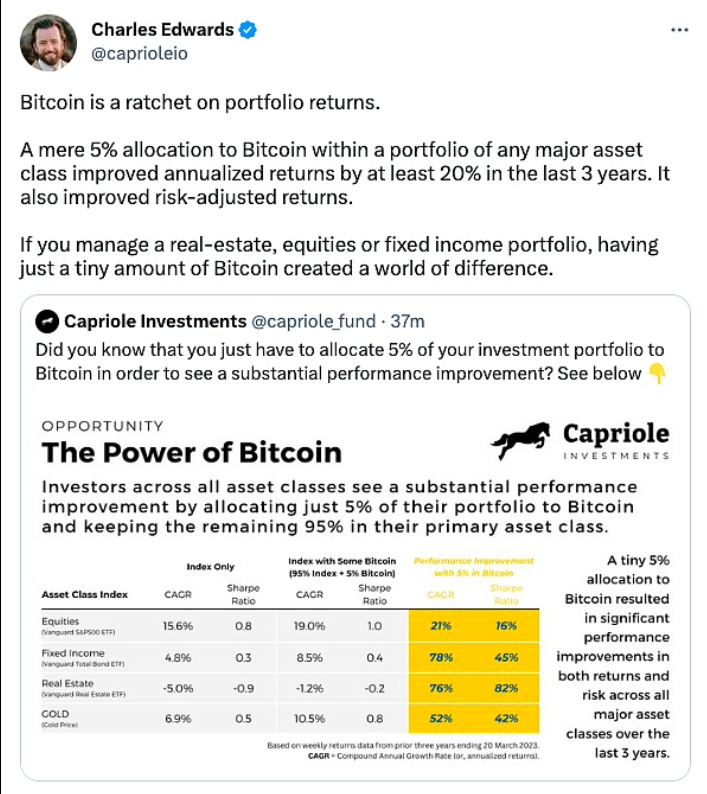 数字资产量化基金Capriole Investments创始人Charles Edwards在社交媒体上称,比特币是投资组合收益的一个“棘轮”。在过去3年中,在任何主要资产类别的投资组合中,只要有5%的比特币配置,就能提高至少20%的年化收益。它也改善了风险调整后的回报。如果你管理的是房地产、股票或固定收益投资组合,只要有少量的比特币就能创造出一个不同的世界。