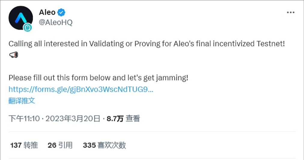 据官方推特,可编程隐私网络Aleo已开放其最终激励测试网验证者与证明者申请。Aleo于2022年10月启动测试网3激励,并将2500万个Aleo积分(ALEO)分发给开发者、证明者和验证者社区。