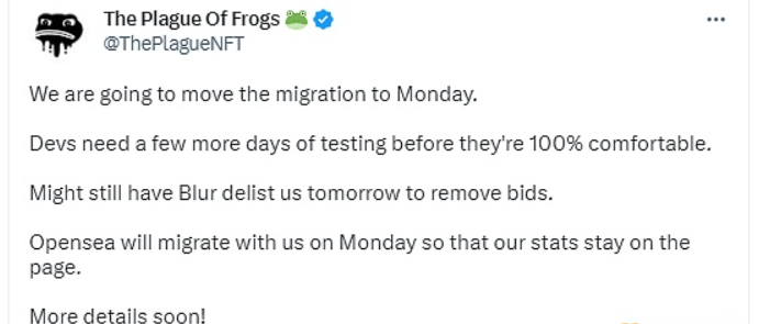 NFT项目The Plague of Frogs在官推宣布将原定于3月24日的新合约迁移并强制执行版税将被推迟到下周一3月27日,因为开发人员需要更多时间测试以确保不会出现问题,届时OpenSea会同步迁移,但Blur可能会在3月25日将NFT退市并取消出价,迁移后新的NFT将会被空投到持有旧The Plague of Frogs NFT的钱包中,且同样可以取消质押、转移和重新质押以获得相同的奖励,据悉强制执行的版税比例将不会高于10%。