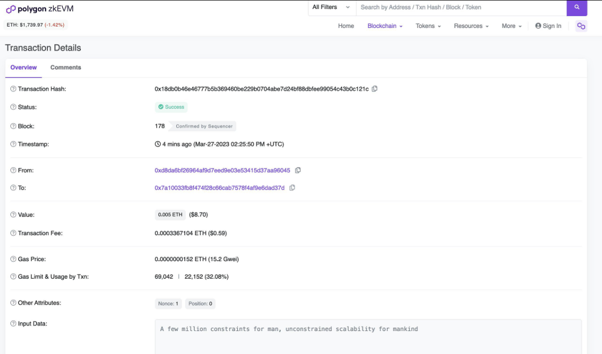 据Polygon Labs开发工程师steph.polygon在社交媒体透露,以太坊联合创始人Vitalik Buterin已在Polygon zkEVM主网上完成了其第一笔交易,交易哈希:0x18db0b46e46777b5b369460be229b0704abe7d24bf88dbfee99054c43b0c121c,交易额为0.005 ETH,交易费0.0003367104 ETH,gas费用0.0000000152 ETH。