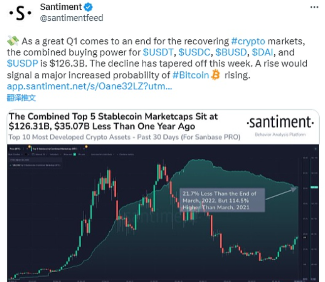 据加密分析公司Santiment在社交媒体公布数据显示,随着加密市场在2023年一季度复苏,USDT、USDC、BUSD、DAI和USDP这五大稳定币的综合购买力(buying power)为1263.1亿美元,此外本周加密市场跌势有所收窄。