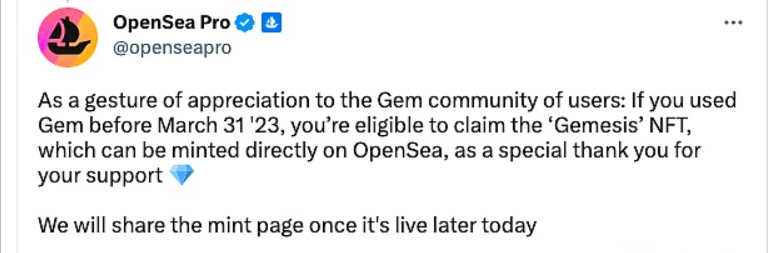 OpenSea Pro宣布,在2023年3月31日之前使用过Gem的用户,有资格领取Gemesis NFT。