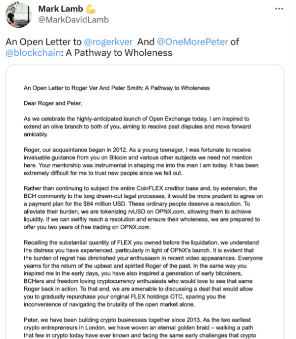 加密货币交易所CoinFLEX联合创始人Mark Lamb向Bitcoin.com创始人Roger Ver发出一封公开信,承诺他可在OPNX上进行两年的免费交易,旨在结束两者之间长期存在的争执,以使Roger Ver向CoinFLEX偿还据称未偿还的贷款。
