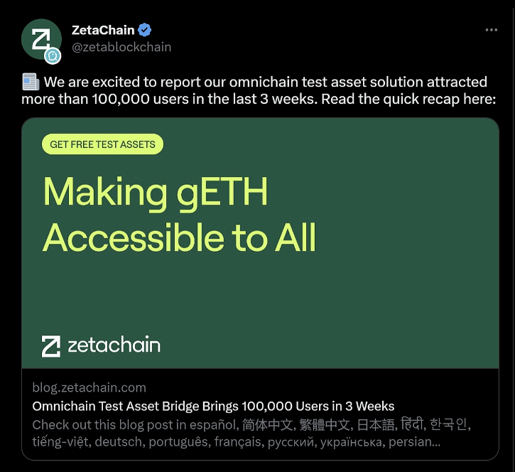 此前报道,3月21日,Zeta Chain验证者激励测试网已经上线并开放申请。