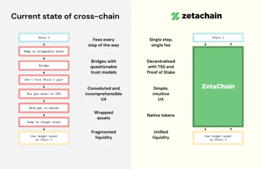 ZetaChain,它是世界上第一个也是唯一一个连接一切的区块链。它促进了跨链和跨层的价值转移、消息传递和智能合约调用,从而首次实现了 omnichain dApps (odApps),可以利用多个网络的流动性,并在所有连接的网络上读取和更新状态。ZetaChain 有内置的去中心化桥,可以进出所有连接的链,因此资产和数据可以轻松地进入和退出 ZetaChain。