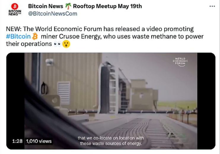 世界经济论坛发布了一段宣传 Bitcoin 矿商 Crusoe Energy 的视频,该公司使用废弃的甲烷为其运营提供动力。