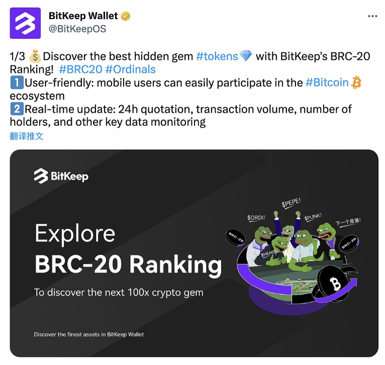 Web3多链钱包BitKeep现已推出BRC-20 Ranking,实时更新BRC-20代币价格变动、24小时涨跌幅、持有人数和交易量等信息,降低移动端用户参与比特币生态的门槛。目前已收录前100名流行的BRC-20代币数据。 据CoinTelegraph采访报道,BitKeep本月将全面接入比特币生态,帮助用户在移动端和浏览器插件使用BTC Taproot地址格式,并支持BRC-20代币及比特币NFT的充提管理、转账交易等操作;同时,BitKeep一直在持续关注BRC21等新协议,根据市场趋势和用户需求,提供更多样化的支持与服务。