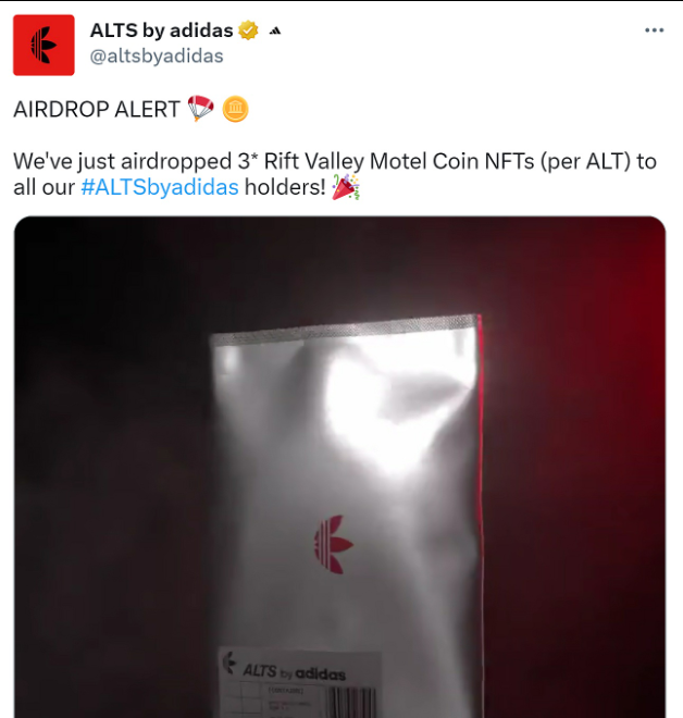 据阿迪达斯官方Web3 Twitter账户ALTSbyadidas,阿迪达斯已向所有ALT持有者空投了“Rift Valley Motel Coin”NFT,每个ALT持有者会收到3枚NFT,该NFT将在阿迪达斯Into The Metaverse项目的第二阶段将发挥作用并将成为参与该阶段的“门票”或“货币”。