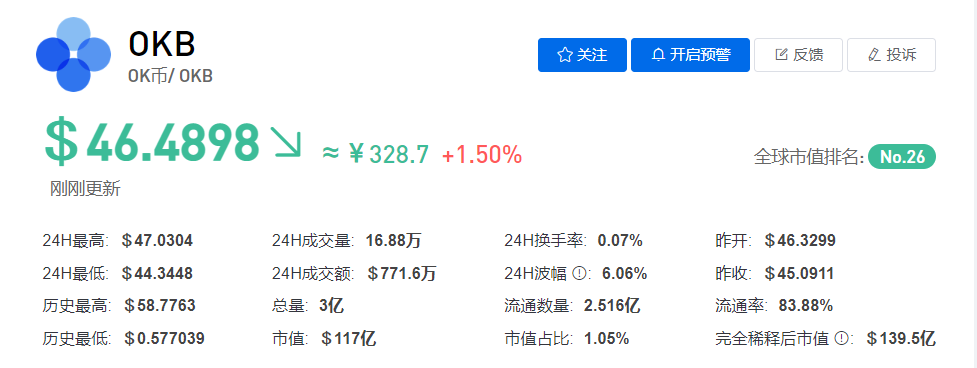 OK币今日行情价格为$46.48,24小时的交易量为$775.439万。OK币在过去24小时内增长了1.5%。目前市值排名为第26位,市值为117.448亿USD。流通总量为25162.7万OKB,发行量为30000万OKB。