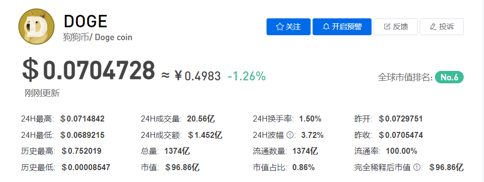 狗狗币今日价格为$0.0704728,其24小时的交易量为$14521.2万。狗狗币在过去24小时内下跌了1.26%。