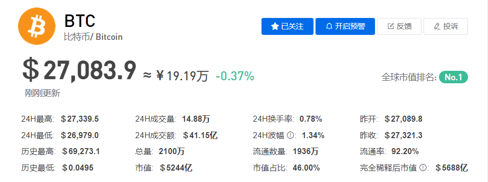 比特币今日美元行情价格为$27083.93,其24小时的交易量为$411520万。比特币在过去24小时内下跌了0.37%。